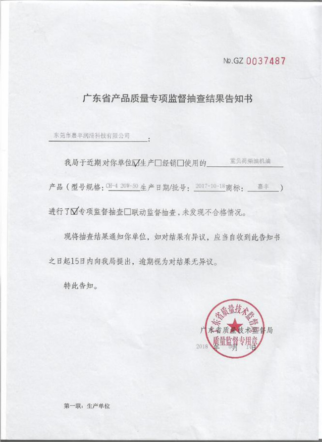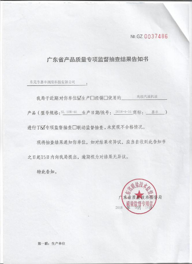 广东省产品质量专项监督抽查结果告知书
